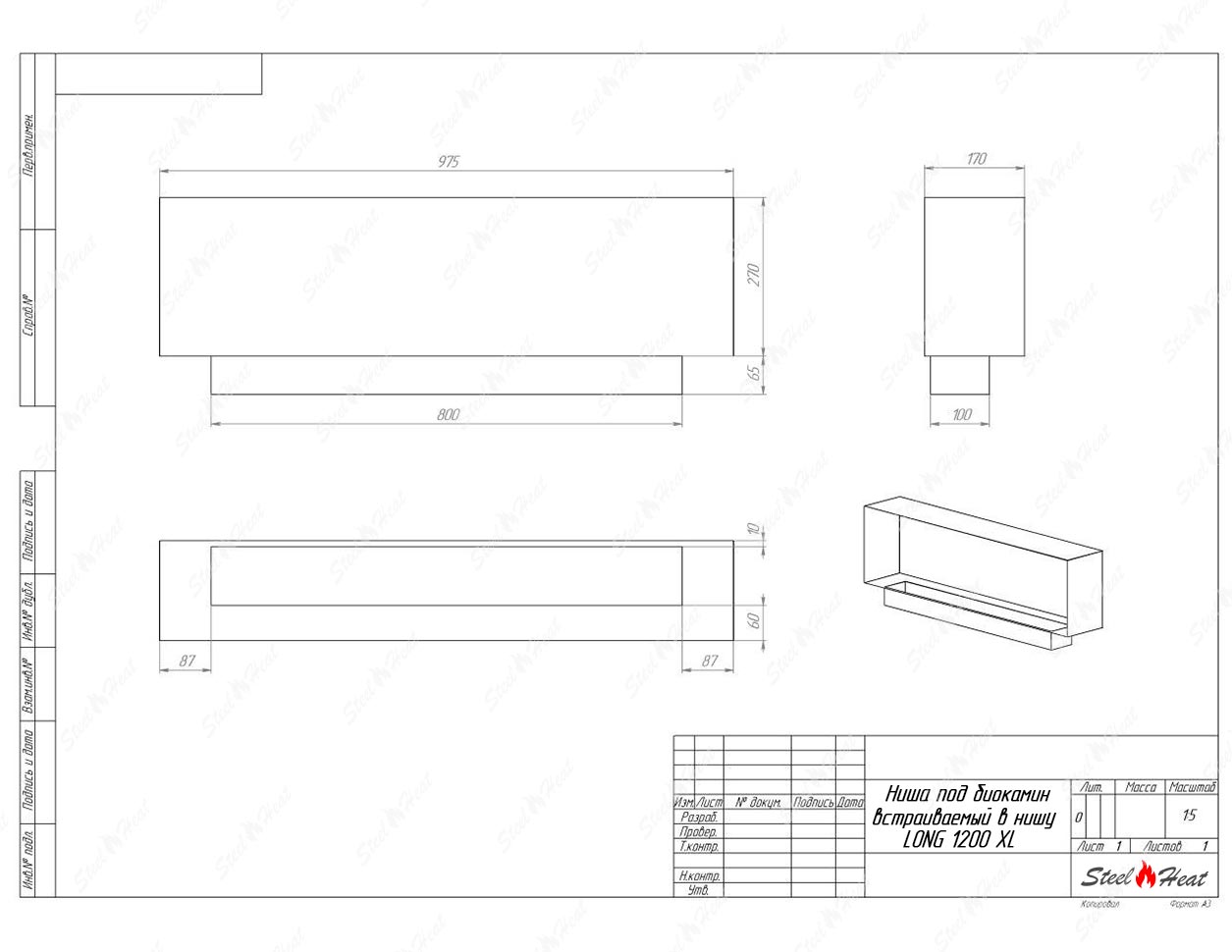 Встраиваемый Биокамин SteelHeat LONG 1200 XL предназначен для встраивания в глухие ниши из гипсокартона, кирпича, пеноблоков, бетона.