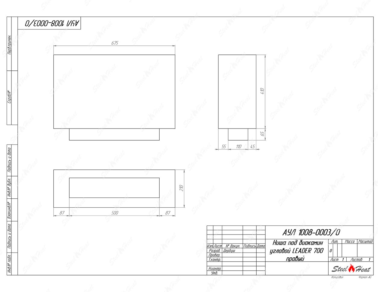 Встраиваемый Биокамин угловой SteelHeat Leader 700 правый предназначен для встраивания в глухие ниши из гипсокартона, кирпича, пеноблоков, бетона.
