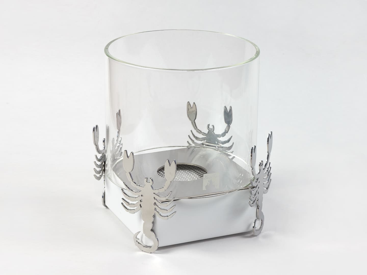 Представляет собой металлический внешний корпус с встроенным топливным блоком Lux Fire 150-2 на декоративных ножках в виде Скорпиона. Огонь ограничивается стеклянным закаленным плафоном диаметром 180 мм.Среднее время горения 3 часа